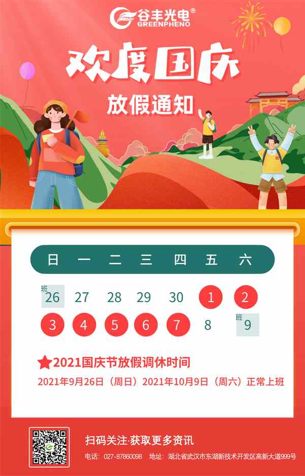 根據(jù)《國務(wù)院辦公廳關(guān)于2021年部分節(jié)假日安排的通知》,并結(jié)合公司的實際情況,現(xiàn)將武漢谷豐光電科技有限公司2021年國慶節(jié)放假安排通知如下: