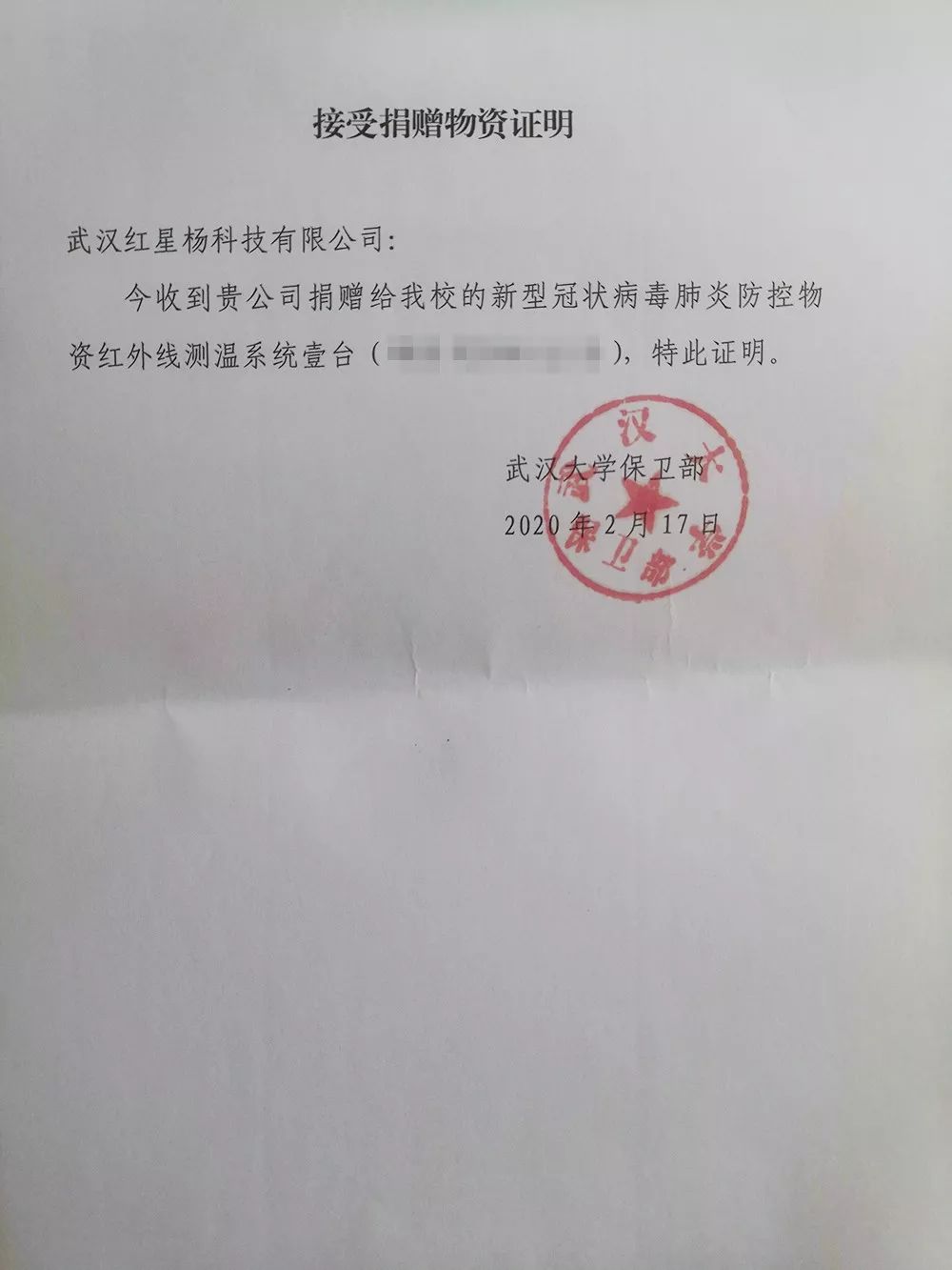 武漢大學(xué)保衛(wèi)部接受捐贈(zèng)物資證明