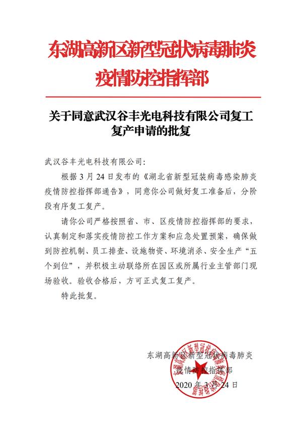 隨著新型冠狀病毒肺炎疫情防控工作的進(jìn)展,國內(nèi)疫情形式逐漸走向明朗,企業(yè)陸續(xù)復(fù)工。谷豐光電也快速響應(yīng)疫情防控指揮部號召,在審批通過后,于2020年4月1日起正式復(fù)工。