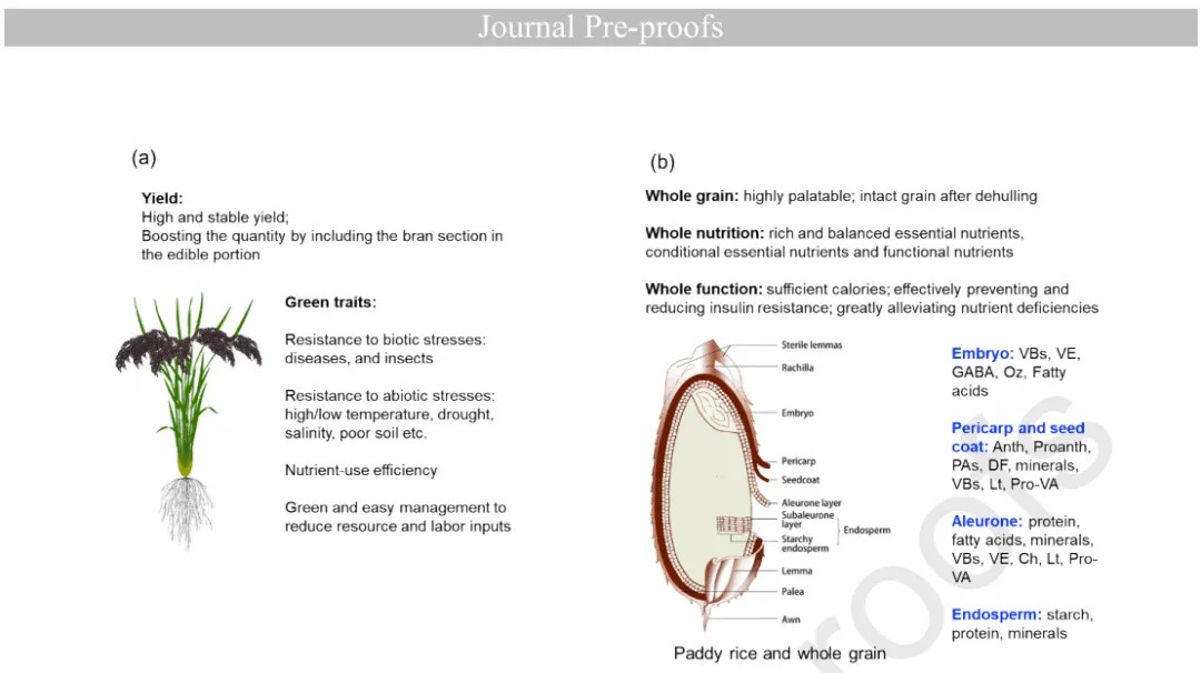 為滿足未來水稻產(chǎn)業(yè)和人類健康的需求,該文發(fā)出培育綠色營養(yǎng)超級稻(GNSR, Green Nutritious Super Rice)的倡議,從而為地球創(chuàng)造更美好的未來。為實(shí)現(xiàn)這一愿景,綠色營養(yǎng)超級稻應(yīng)具備以下特征:高產(chǎn)且穩(wěn)產(chǎn);綠色農(nóng)業(yè)性狀,包括對生物和非生物脅迫的抗性,以及其他有助于資源節(jié)約、環(huán)境友好的特性;全谷物,尤其是果皮種皮積累花青素的全谷黑米。以全谷黑米作為營養(yǎng)健康主食替代目前僅包含胚乳的精白米,為人類提供齊全平衡的營養(yǎng)素(全營養(yǎng)),促進(jìn)人類健康。
