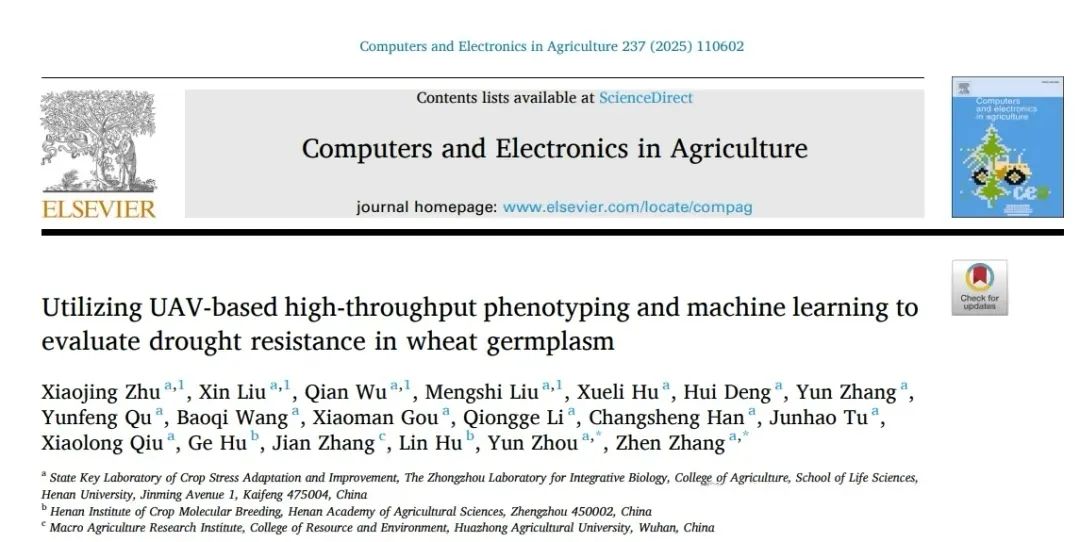 分享一篇河南大學小麥研究團隊關于利用無人機技術結合機器學習進行小麥抗旱性評價的研究成果于2025年5月28日在中科院一區(qū)TOP期刊Computers and Electronics in Agriculture,以“Utilizing UAV-based high-throughput phenotyping and machine learning to evaluate drought resistance in wheat germplasm”為題的文章,為小麥抗旱表型評估、利用和育種改良提供了重要參考。