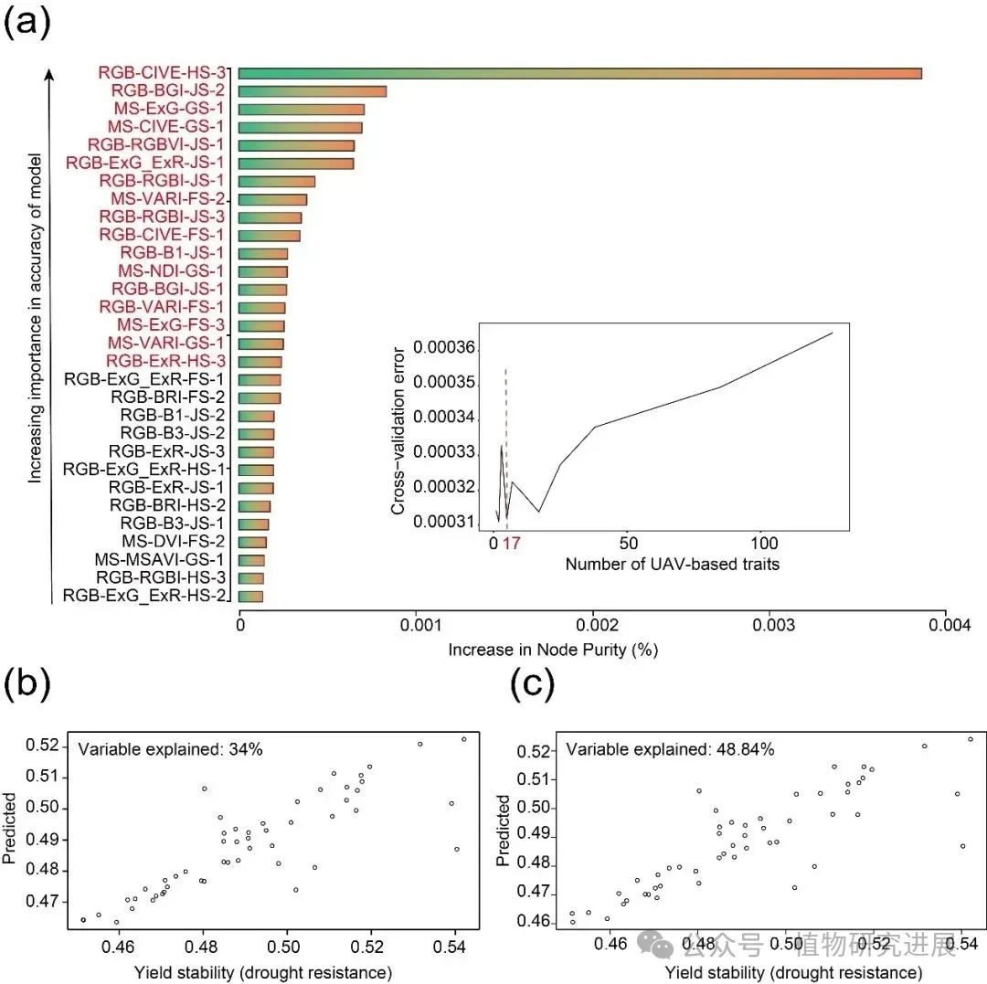 研究進一步利用多種機器學習方法(隨機森林、lasso回歸和嶺回歸)對127個光譜數據進行深度挖掘,構建干旱條件下產量穩(wěn)定性的預測模型,比較分析顯示,隨機森林的產量估算效果最佳,其次是lasso回歸和嶺回歸。通過隨機森林模型最終篩選出17個光譜指標,這些指標共同解釋了干旱條件下產量穩(wěn)定性變異的48.84%(圖2)?;谶@17個指標的綜合評價D值,從52個基因型中鑒定出1個高度抗旱種質和13個抗旱種質,并通過田間試驗進一步驗證了預測結果的可靠性。這項研究不僅證實了無人機技術在抗旱性評估中的有效性,篩選出的優(yōu)異種質資源為抗旱遺傳改良提供了重要材料,更重要的是建立了一套基于多源數據融合和機器學習的抗旱種質鑒定新方法,為應對全球氣候變化背景下的小麥抗旱育種提供了創(chuàng)新性解決方案。